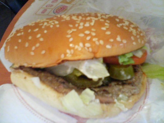 私も話のネタとして二度挑戦してきました。一回目はワッパーで、二回目はダブルワッパーチーズ。まあ、あれで700円からから900円なら安いかと思いました。しかしさすがの私も、○女史(推定オーバー40)がワッパー4個という伝説を前に潔く退散。まだ死にたくありません。てか1回おかわりすりゃ十分。